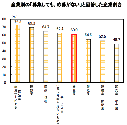 実際に人手不足を感じて求人募集をした企業のうち「募集しても、応募がない」と回答した割合は全体の6割以上です。以下のデータから、飲食サービス業や宿泊業、建築業、医療・福祉産業において人手不足の課題がとくに顕著であるのもわかります。