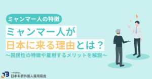 本記事では、日本で働くミャンマー人の就労状況や日本に来て働く理由を解説しています。ミャンマー人を受け入れるメリットや必要な在留資格、雇用する流れも紹介しているので参考にしてみてください。