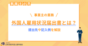 外国人雇用状況届は、従業員が雇用保険に加入する翌月10日前までに、加入しない場合は翌月末までに管轄のハローワークへ提出します。