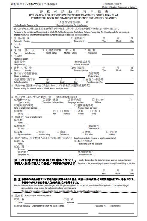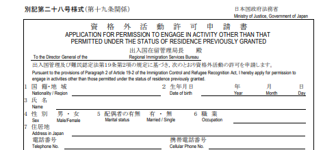 出入国在留管理庁のWebサイトにて資格外活動許可申請書をダウンロードし、A4サイズの用紙に印刷して必要事項を記入します。