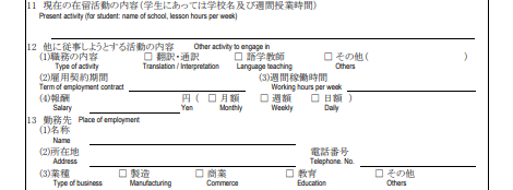 11現在の在留活動の内容現在の主な活動内容を具体的に記入する。留学生の場合は学校名と1週間の授業時間数を記載する(例:◯◯大学で週20時間の授業を受講)