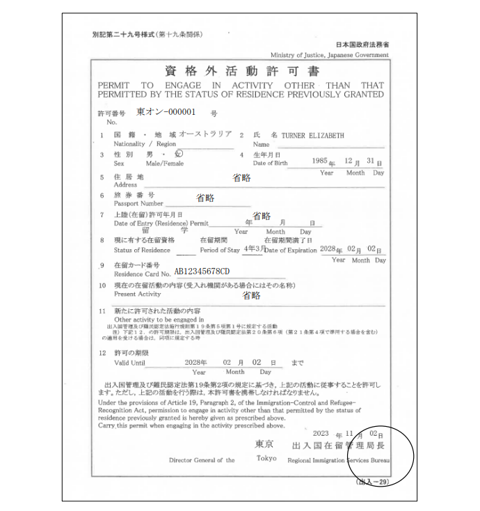 許可が下りると、証印シールではなく資格外活動許可書が郵送で届きます。